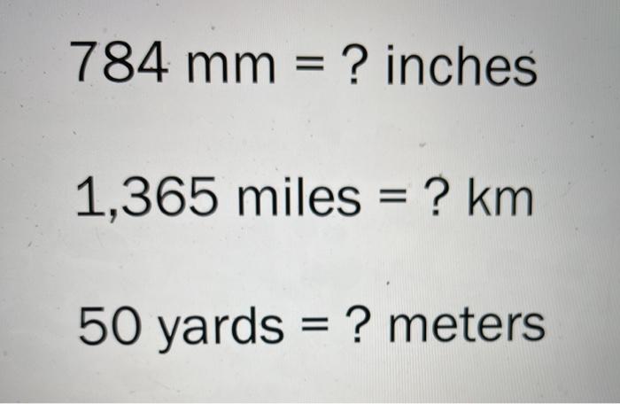 Solved 784 Mm Inches 1 365 Miles Km 50 Yards Chegg Com